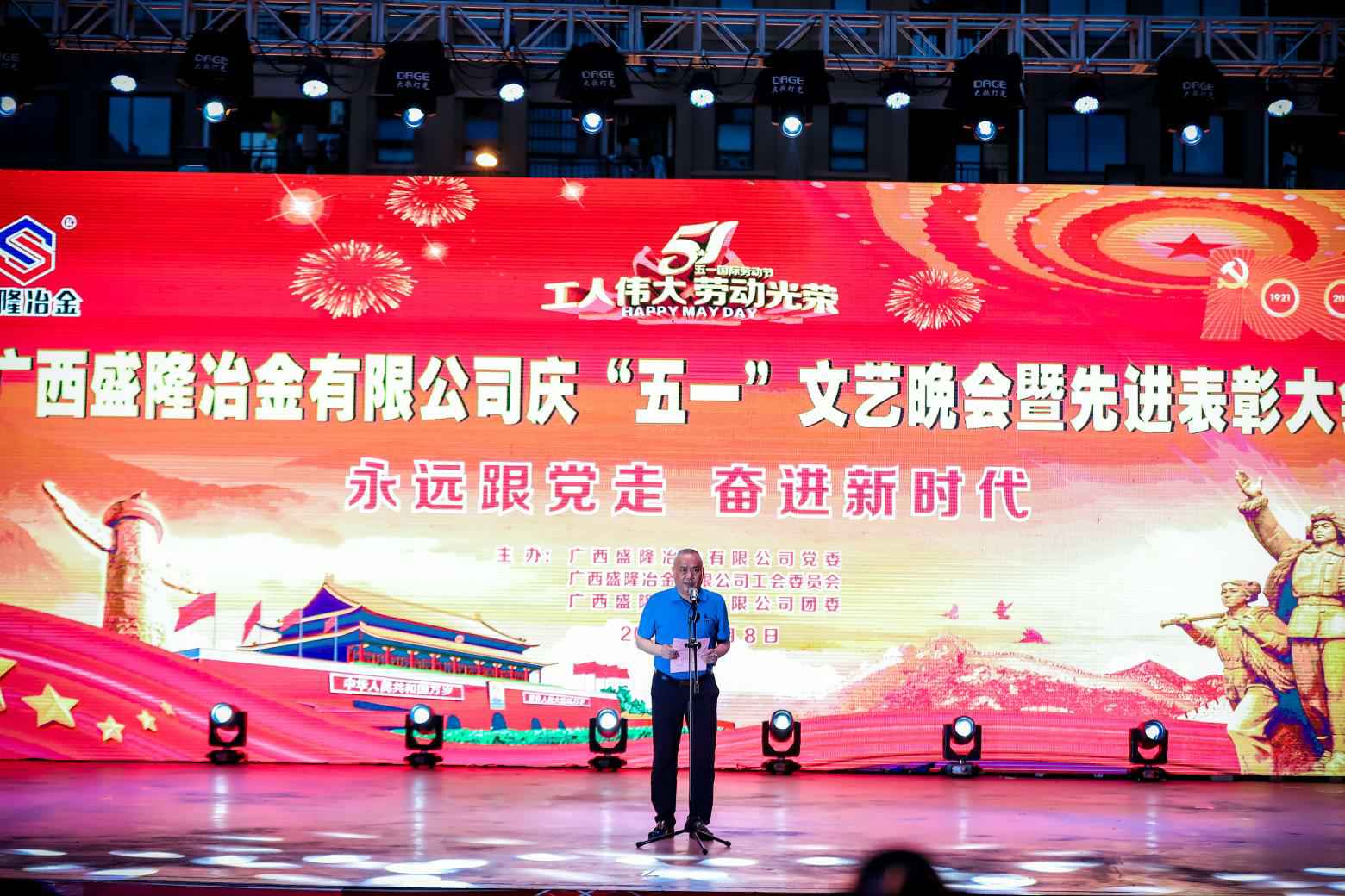 5月8日晚,乐竞体育·(LEJING)官方网站- 登录入口盛隆佳园文化广场歌声嘹亮,掌声如潮。由乐竞体育·(LEJING)官方网站- 登录入口党委、工会委员会、团委联合主办的“永远跟党走,奋进新时代——庆‘五一’文艺晚会暨先进表彰大会”在这里隆重举行。公司常务副总经理陈亮出席晚会并致辞,副总经理兼安环总监吕华民、副总经理兼技术中心主任刘光穆、总工程师兼规划发展部经理梁新亮、总经理助理兼广西广盛高强耐磨新材料有限公司总经理王文凯、党委常务副书记游元喜、工会主席兼总经理办公室主任刘明奇及各厂部主要领导出席。